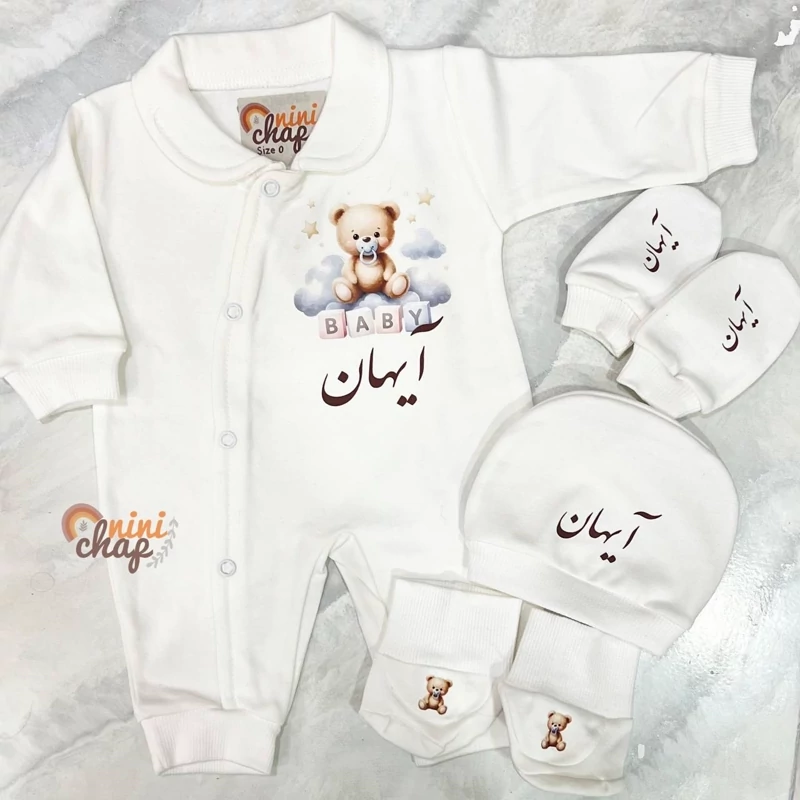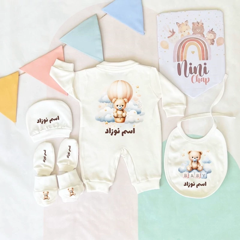 ست بیمارستانی با چاپ اسم نوزاد طرح خرس بالن