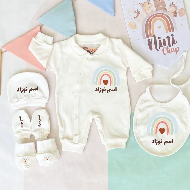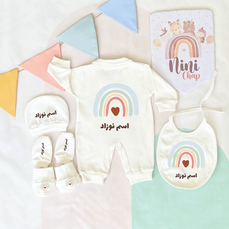ست بیمارستانی با چاپ اسم نوزاد طرح رنگین کمان آبی